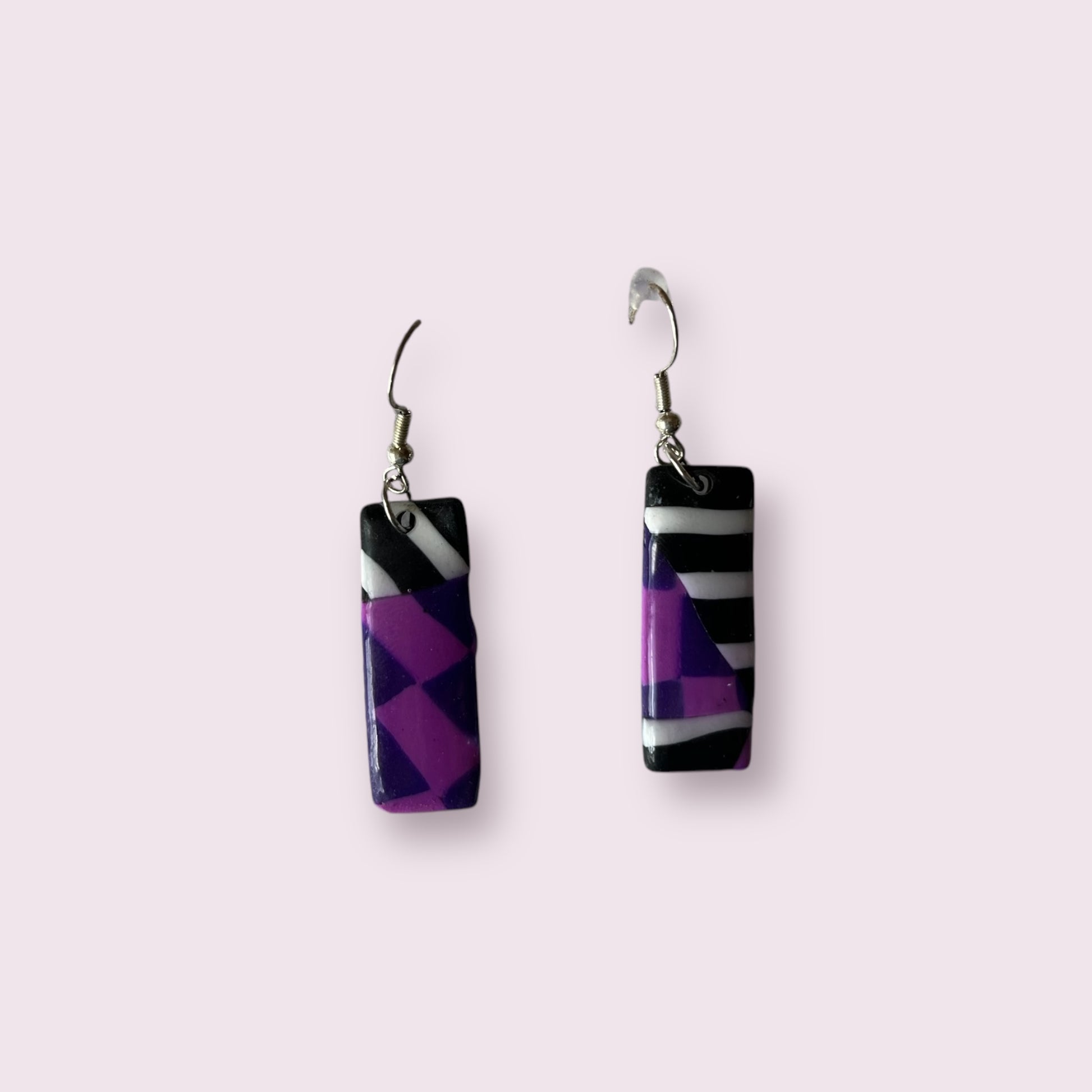 Modelo Collage en forma rectangular con estampado en cuadros magenta y morado y estampado blanco y negro de 1.2cm x 3.3cm.
