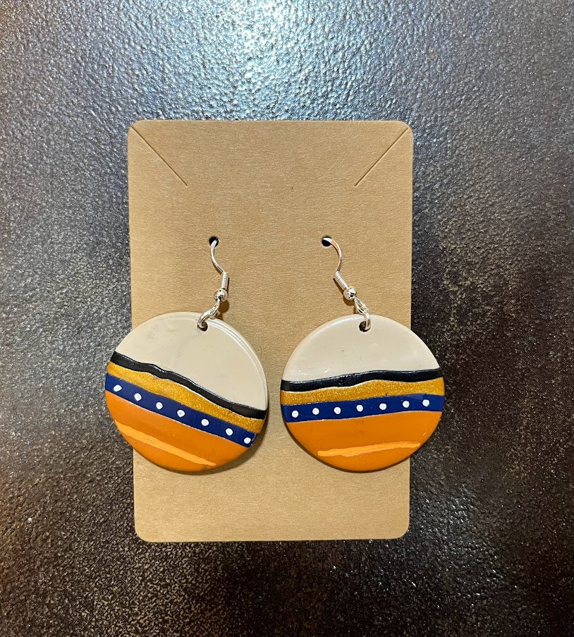 Modelo Mimi con forma circular y un estampado en tonos terracota, dorado, azul, negro y blanco.