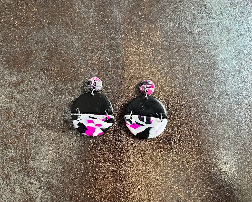 Modelo Nika Twin mitad del círculo en N-negro y la otra mitad en estampado magenta, gris, negro y blanco.