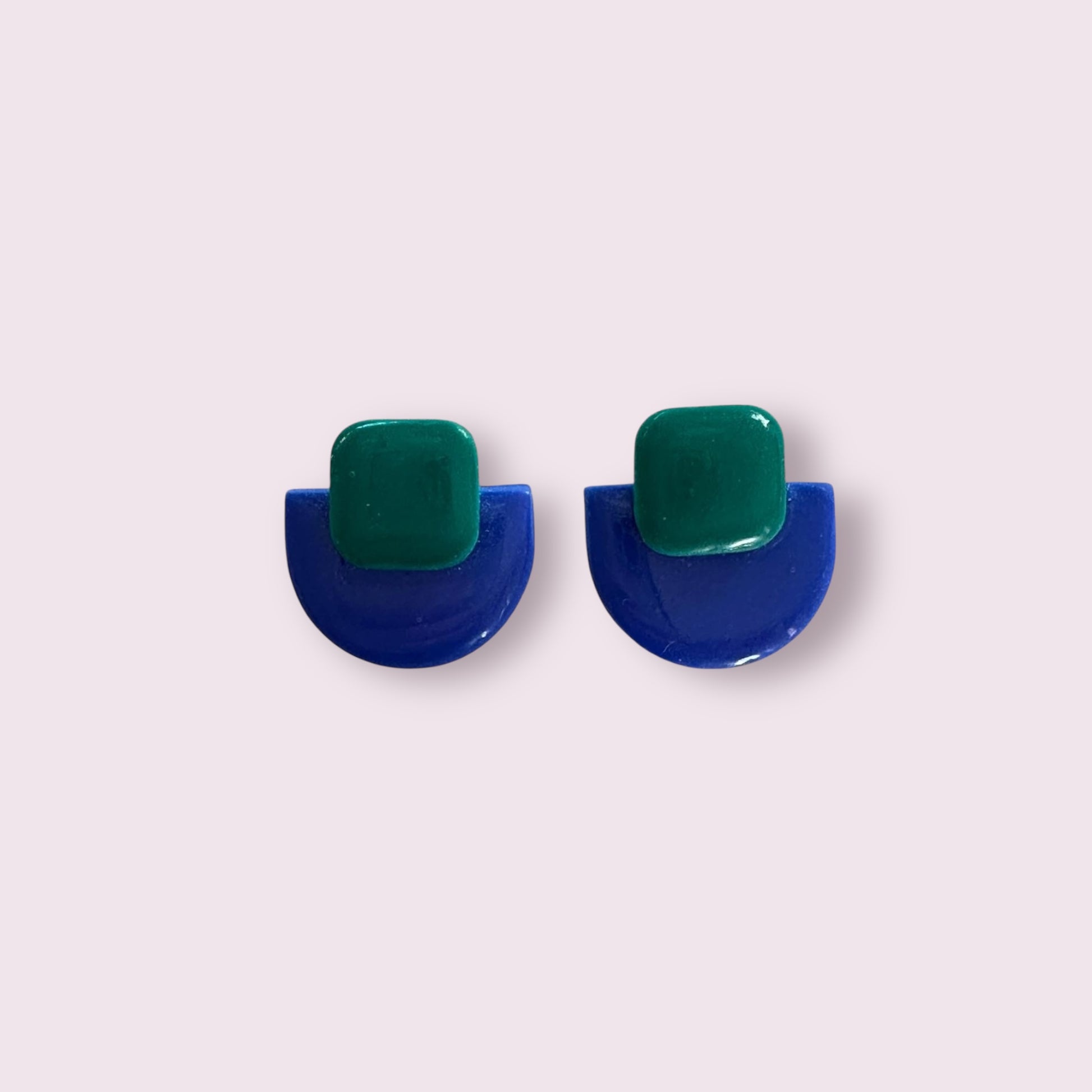 Modelo Nika Square formado por una pieza de color azul de 2.5cm x 2cm y un cuadrado de color verde de 1.5cm x 1.2cm. Midiendo el pendiente un total de 2.2cm x 2cm.