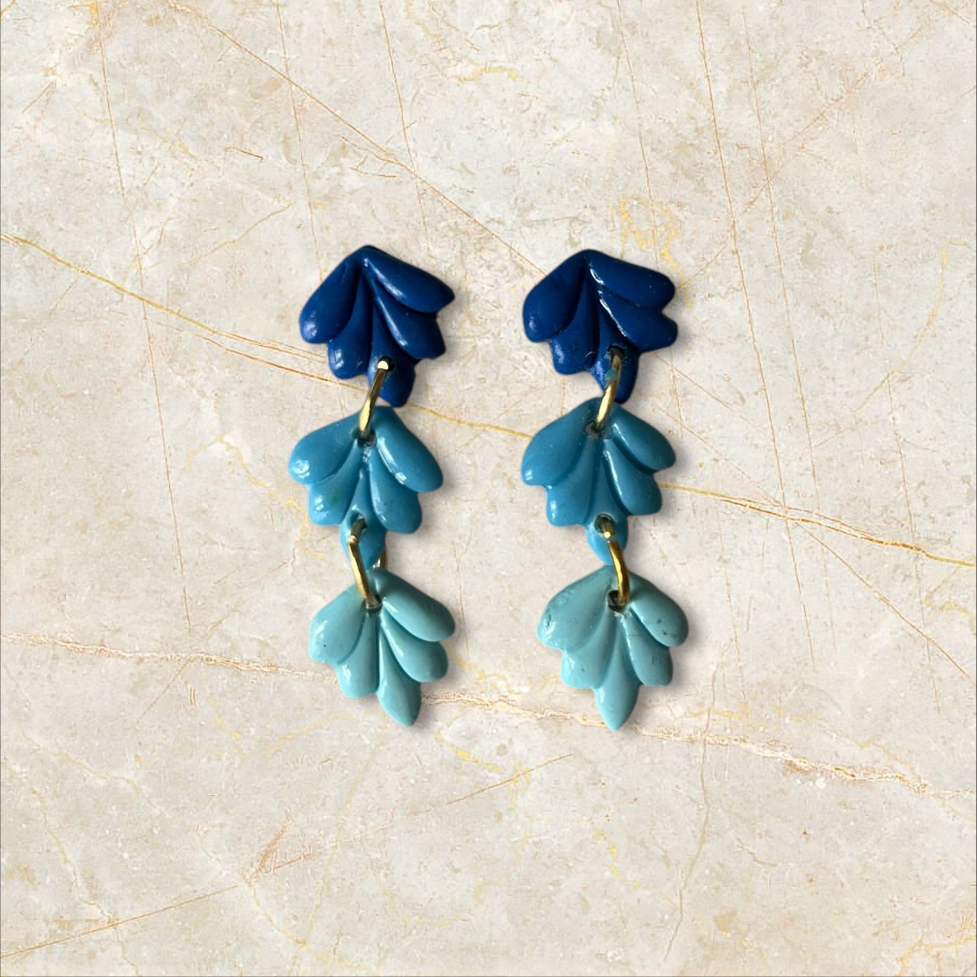 Modelo Pocahontas de tres piezas en tonos azul oscuro en forma de hoja. El pendiente mide 5 cm en total.