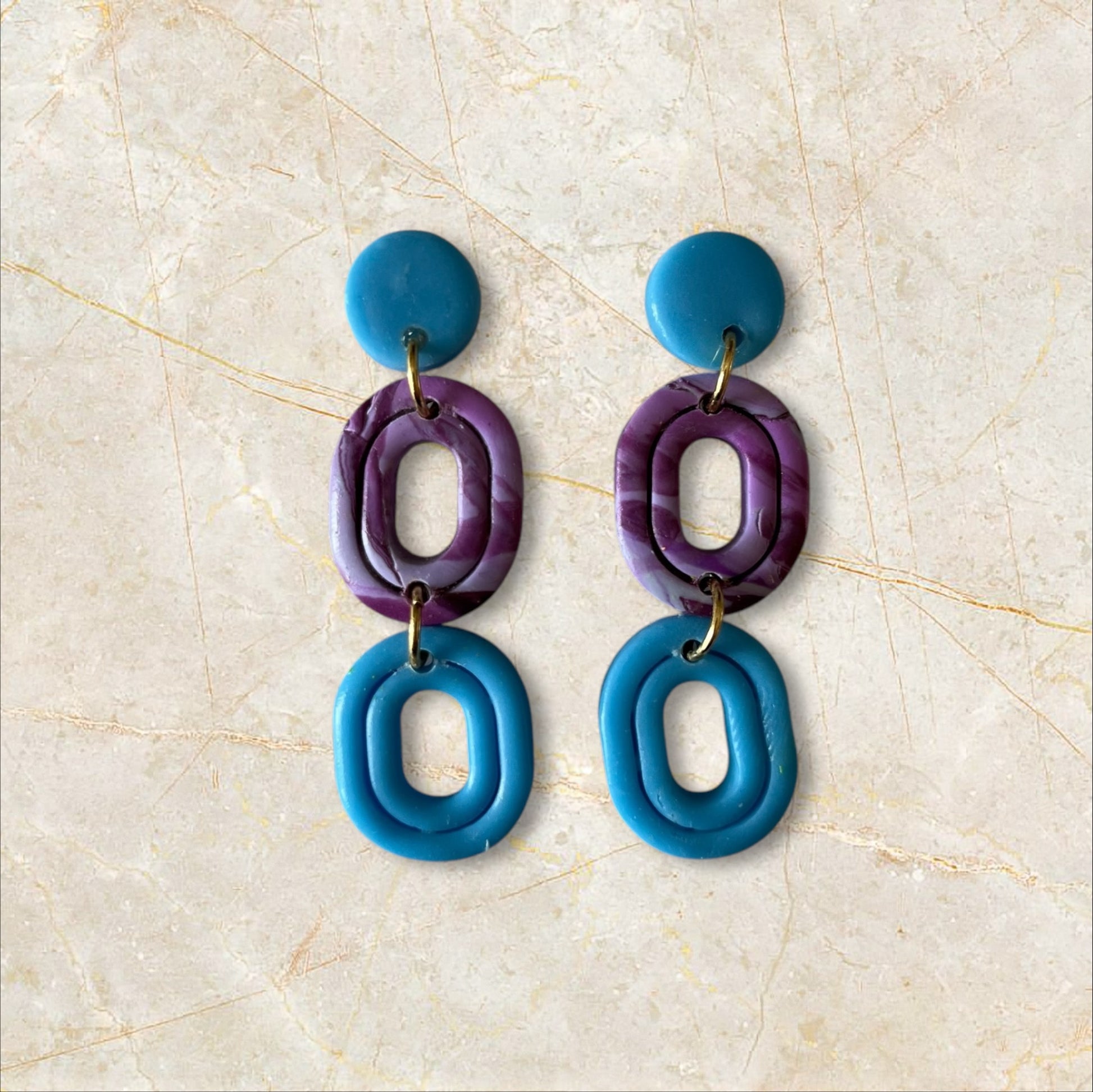 Modelo Vega forma una cadena con dos eslabones estriados, uno en color azul claro y diferentes tonos de morado.