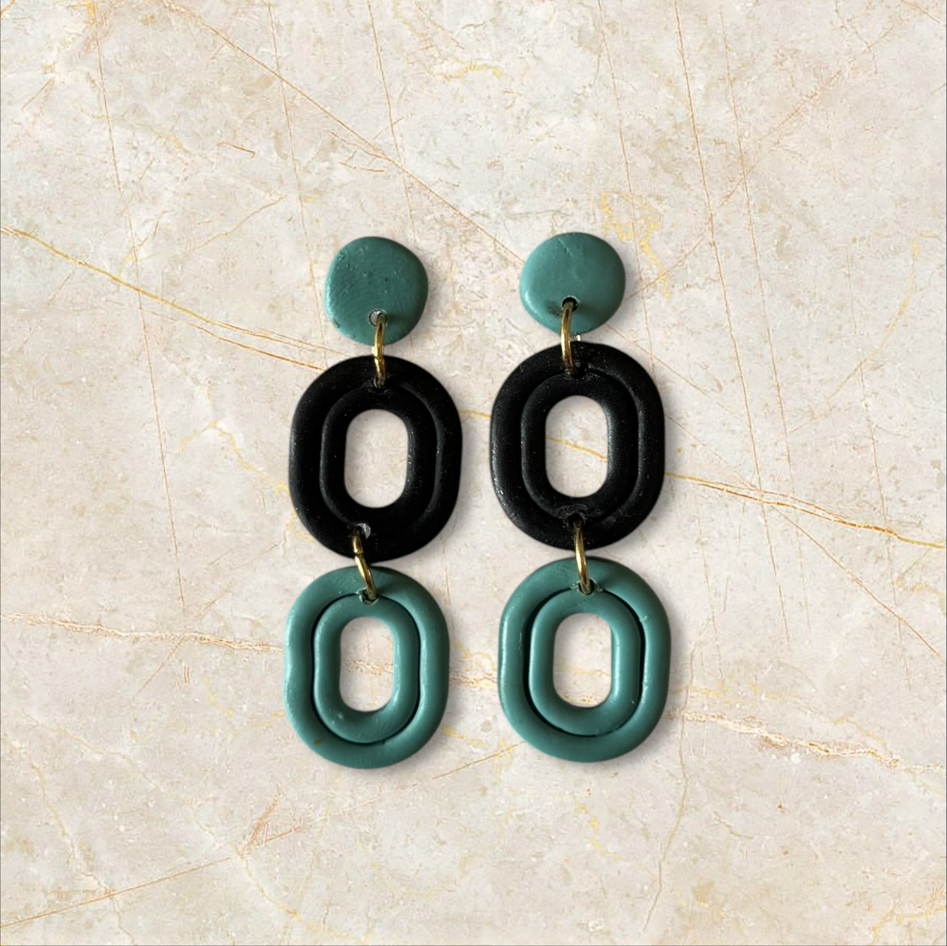 Modelo Vega forma una cadena con dos eslabones estriados, uno en color azul hrisáceo y otro color negro.