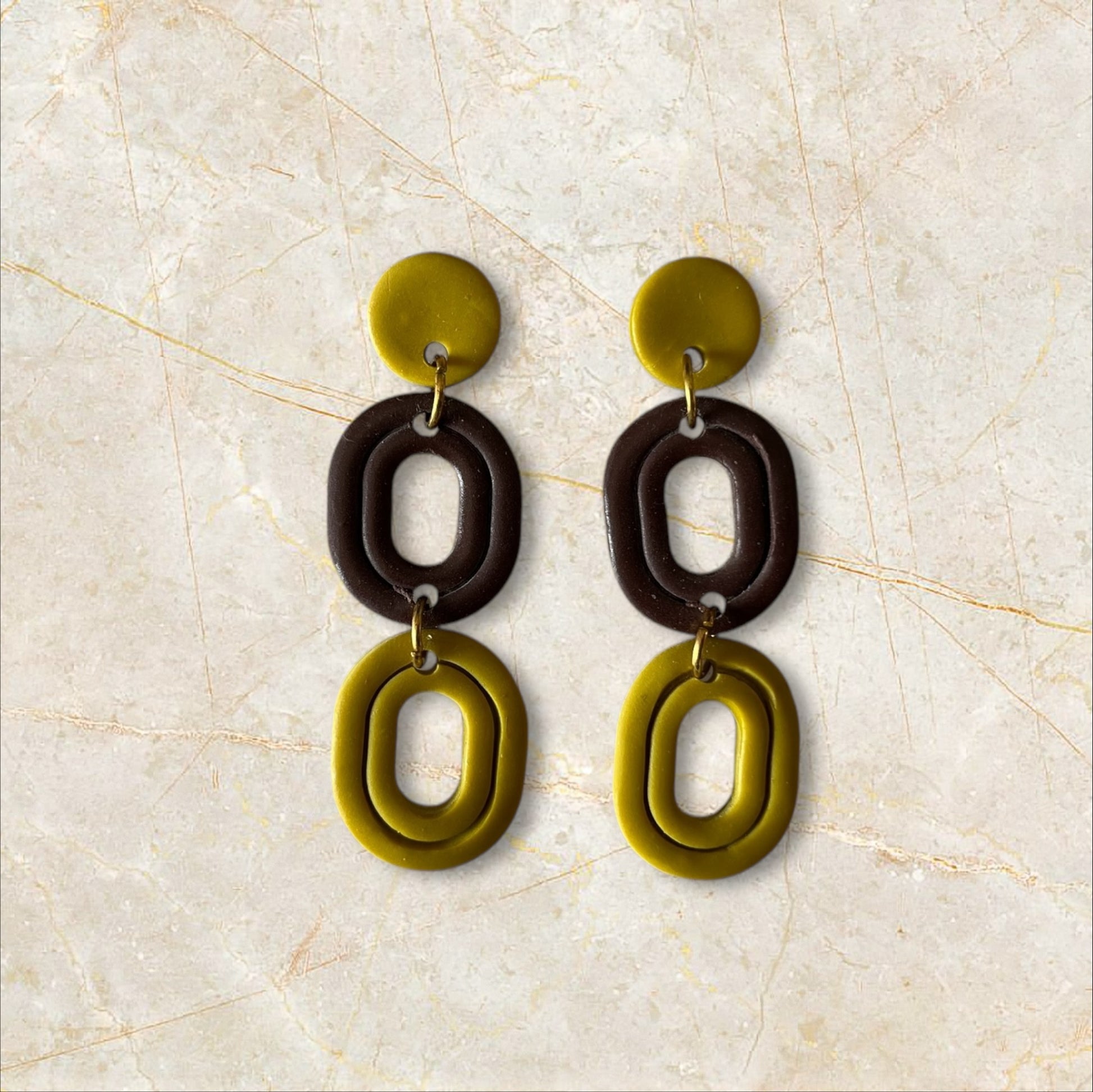Modelo Vega forma una cadena con dos eslabones estriados, uno en color oliva y otro en marrón chocolate