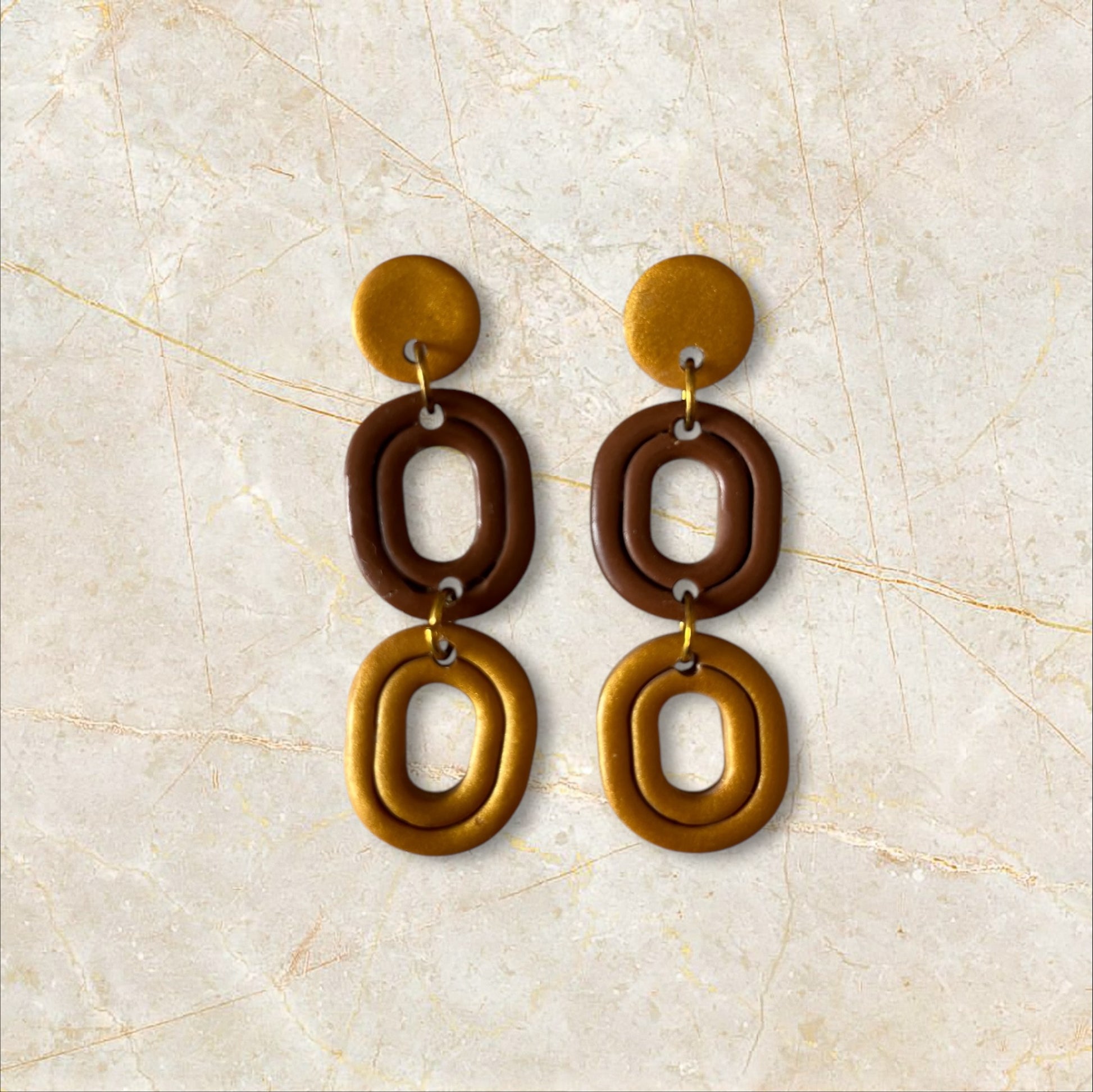 Modelo Vega forma una cadena con dos eslabones estriados, uno en color caramelo y otro en dorado.
